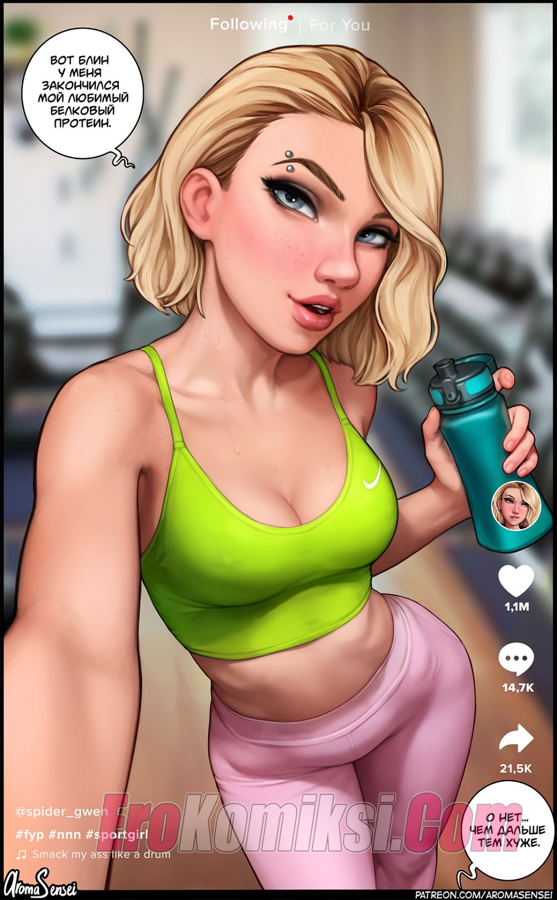 Порно комикс Тикток Гвен. AromaSensei. Горячая блондинка Гвен стала снимать свое прекрасное тело в тикток, а затем встретилась с пареньком с большим черным хуем