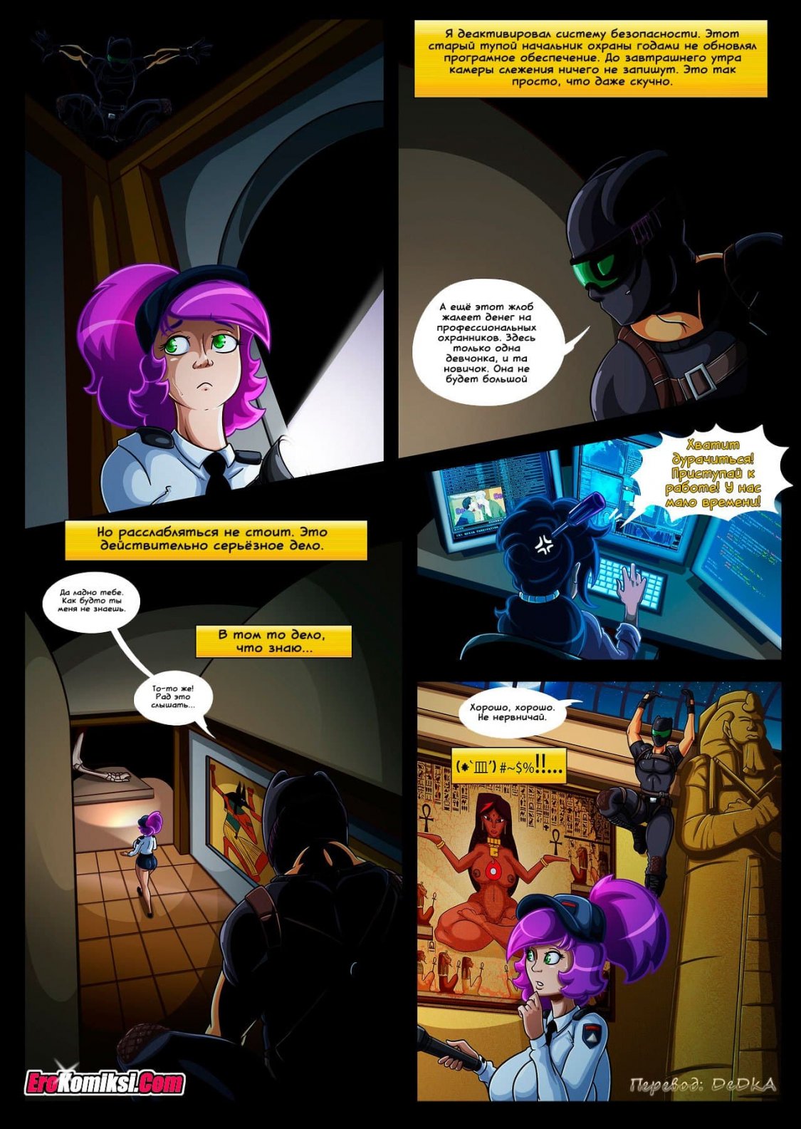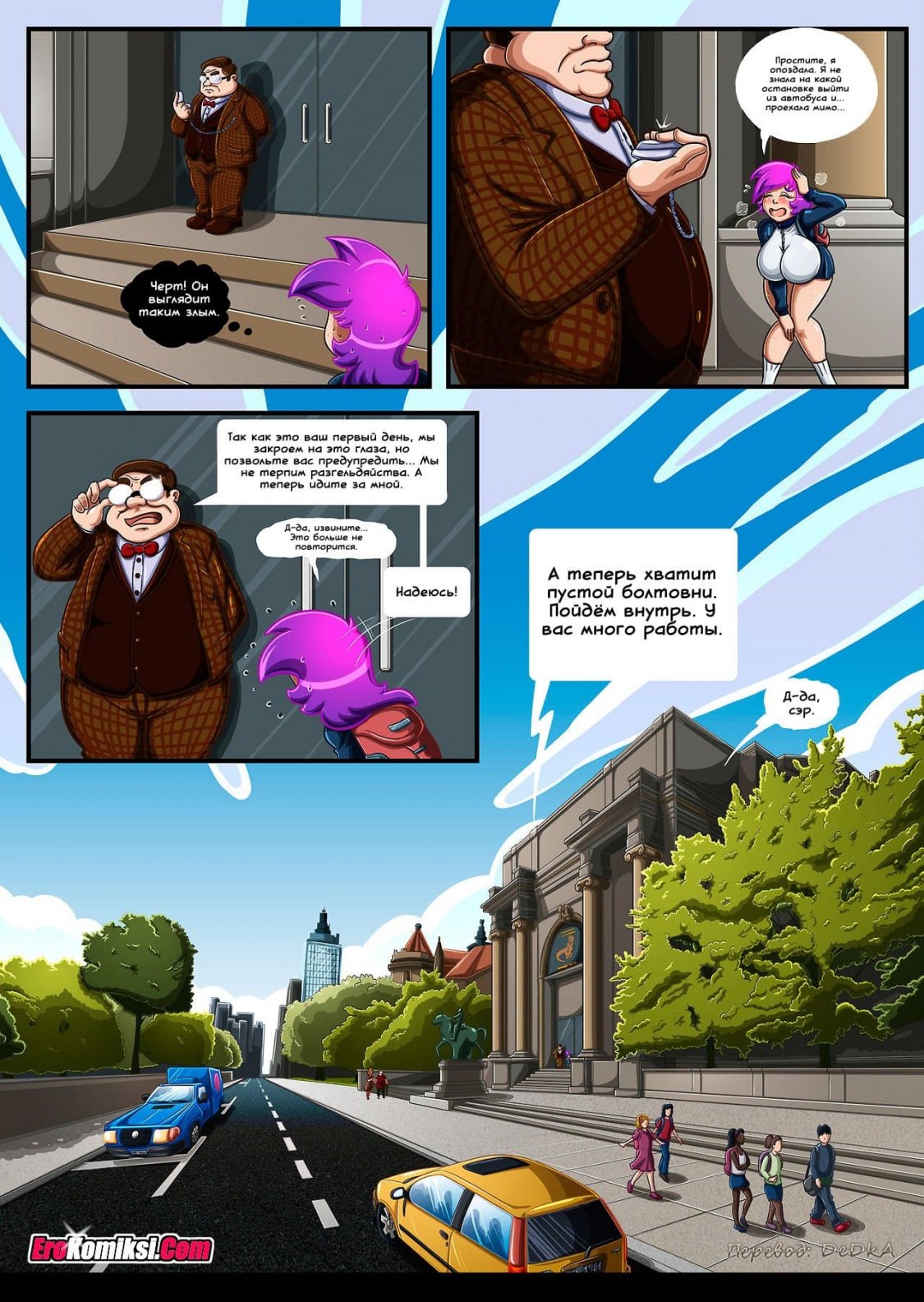 Порно комикс Цепная реакция расскажет о том, как одна девушка устроилась на работу в службу охраны музея естественной истории. Её первый рабочий день, как-то сразу не задался. Началось с того, что она опоздала на работу. Правда