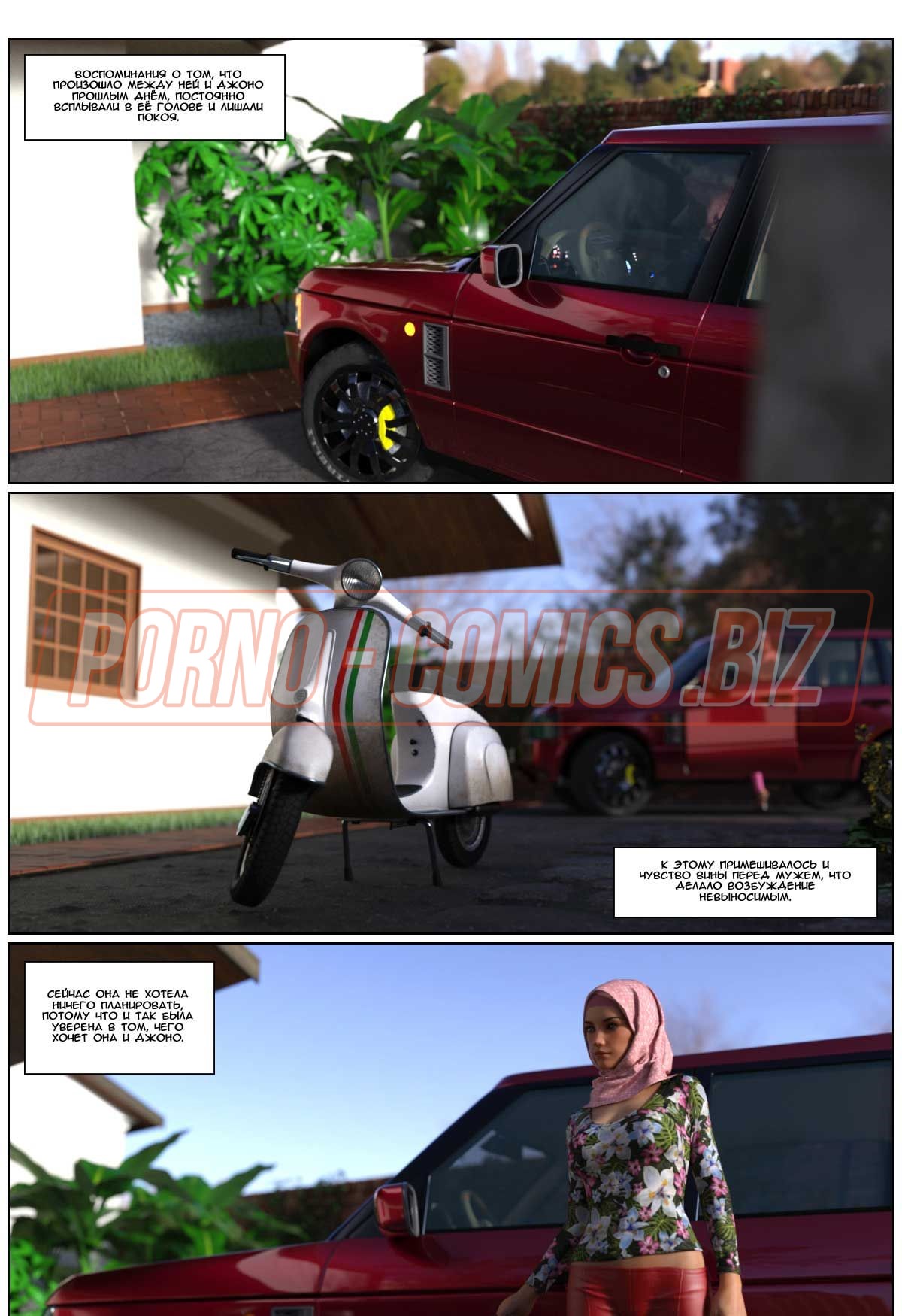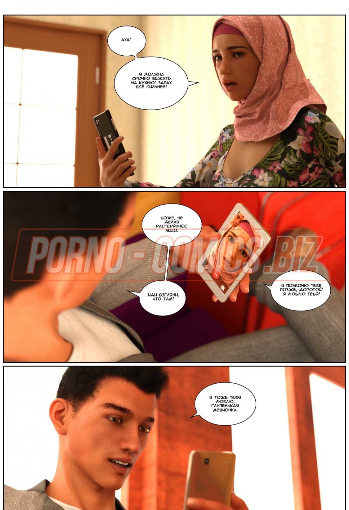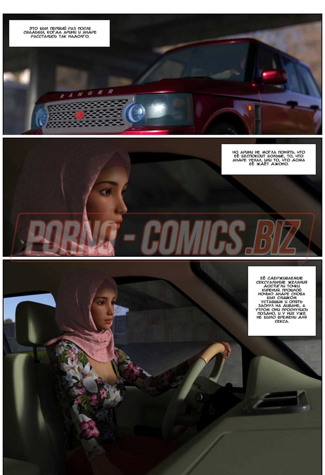 В 3 части 3д комикса «Любовная история» главная героиня с хиджабом на голове провожает своего мужа в командировку. Посадив любимого на самолет, грудастая женушка-арабка спешит домой. Пока у них живет некий Джоно - партнер мужа по работе, супруга не может спокойно дышать в его присутствии. Как только она приходит домой и видит Джона без одежды, сразу сдается и набрасывается на член, чтобы его пососать.
