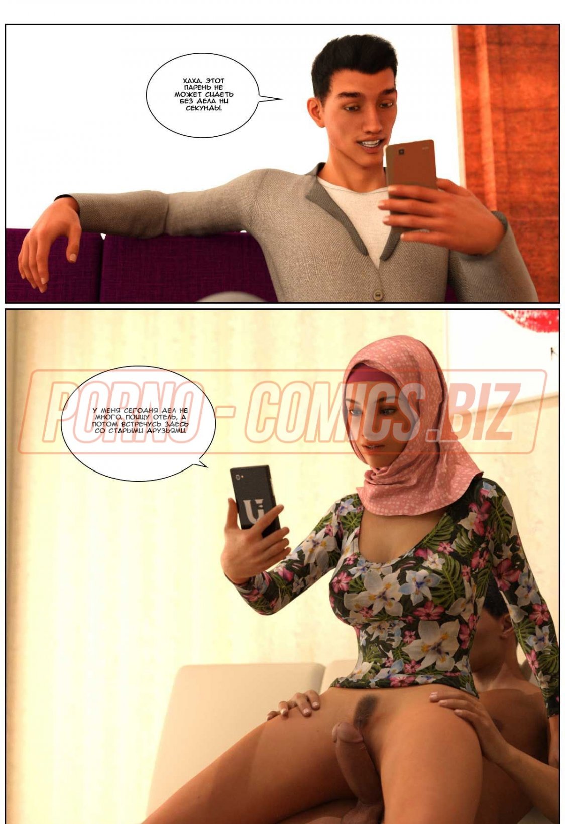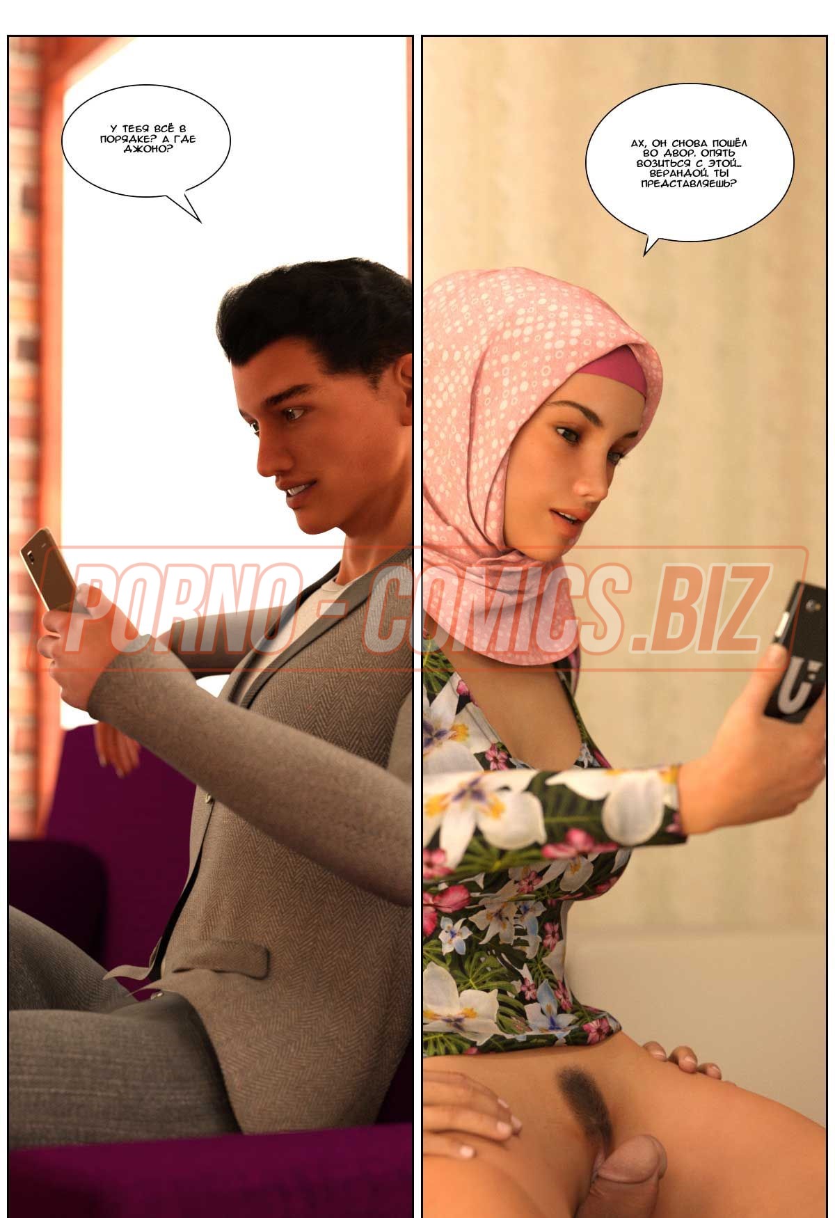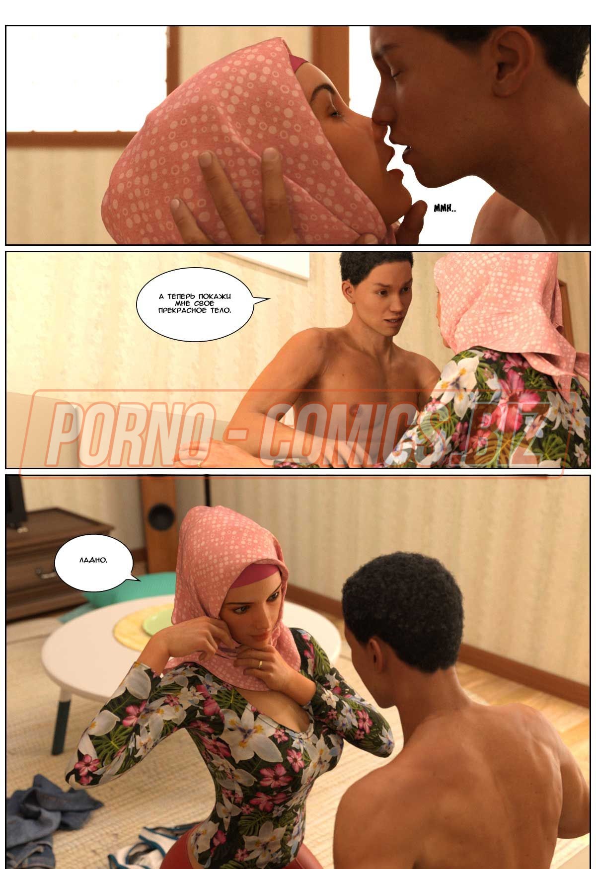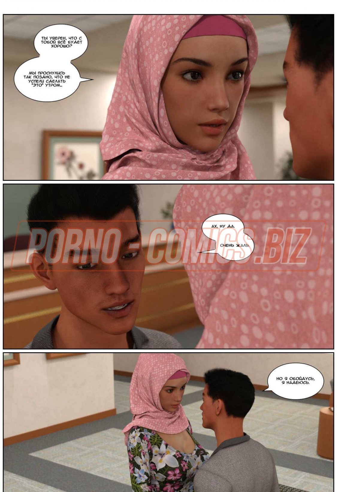 В 3 части 3д комикса «Любовная история» главная героиня с хиджабом на голове провожает своего мужа в командировку. Посадив любимого на самолет, грудастая женушка-арабка спешит домой. Пока у них живет некий Джоно - партнер мужа по работе, супруга не может спокойно дышать в его присутствии. Как только она приходит домой и видит Джона без одежды, сразу сдается и набрасывается на член, чтобы его пососать.