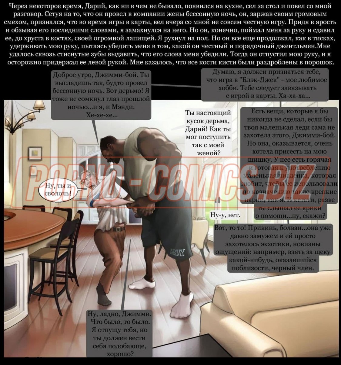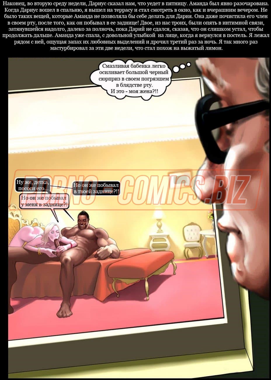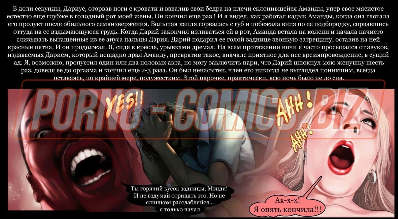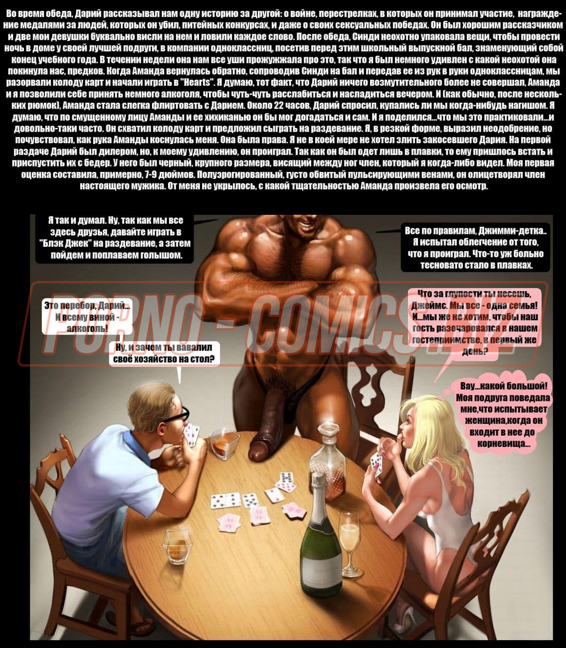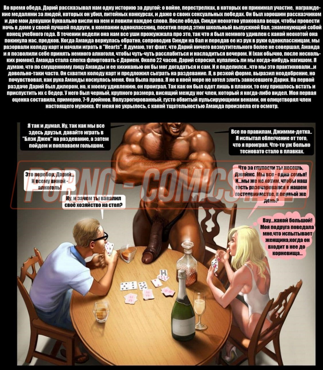 Смотрите эротический секс комикс о том, как чернокожий развратник с нереально огромным членом между ног и его приятель с белым цветом кожи после долгой разлуки решили собраться вместе и сыграть в карты. Взяв в компанию свою женушку, белый трахарь предлагает им втроем сыграть в карты. Начав игру, он не думал, что дойдет до того, что он проиграет ненасытному негру свою возлюбленную на всю ночь.