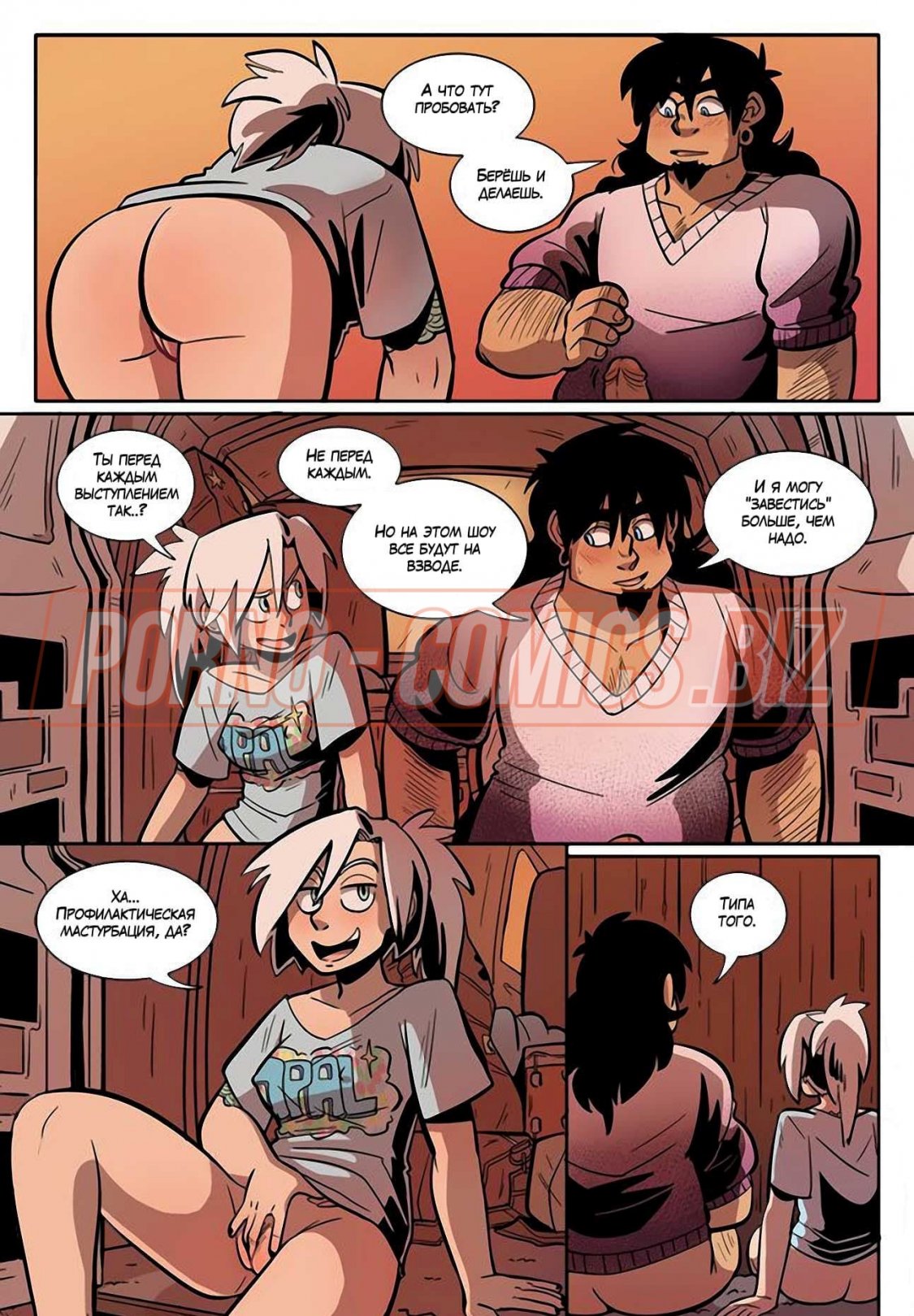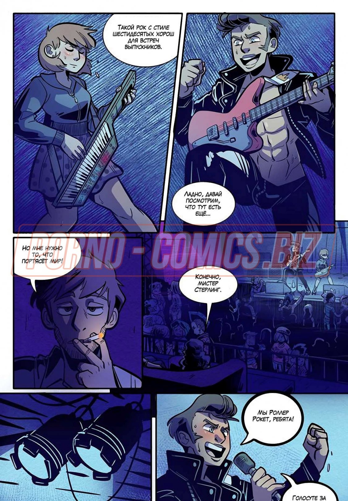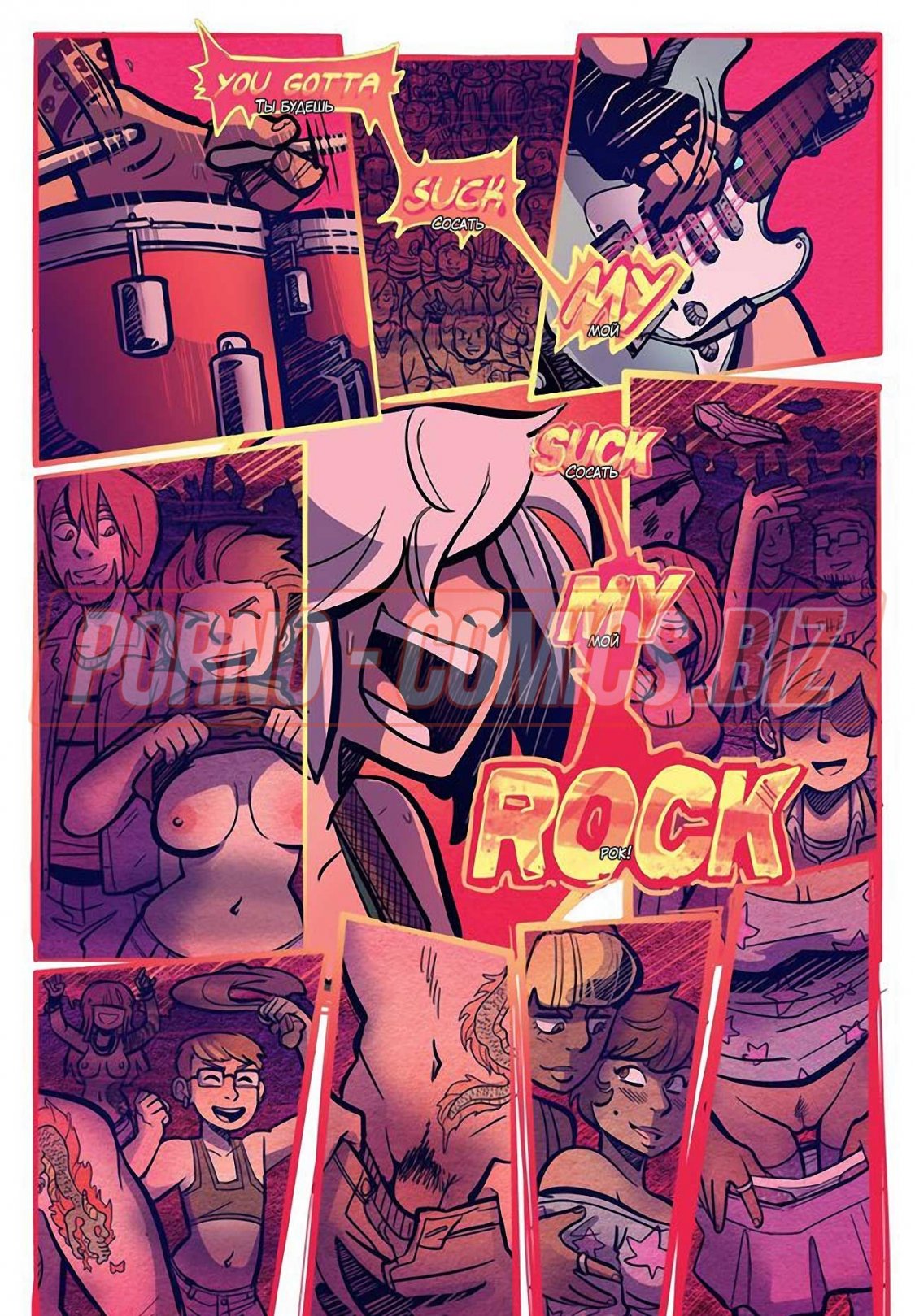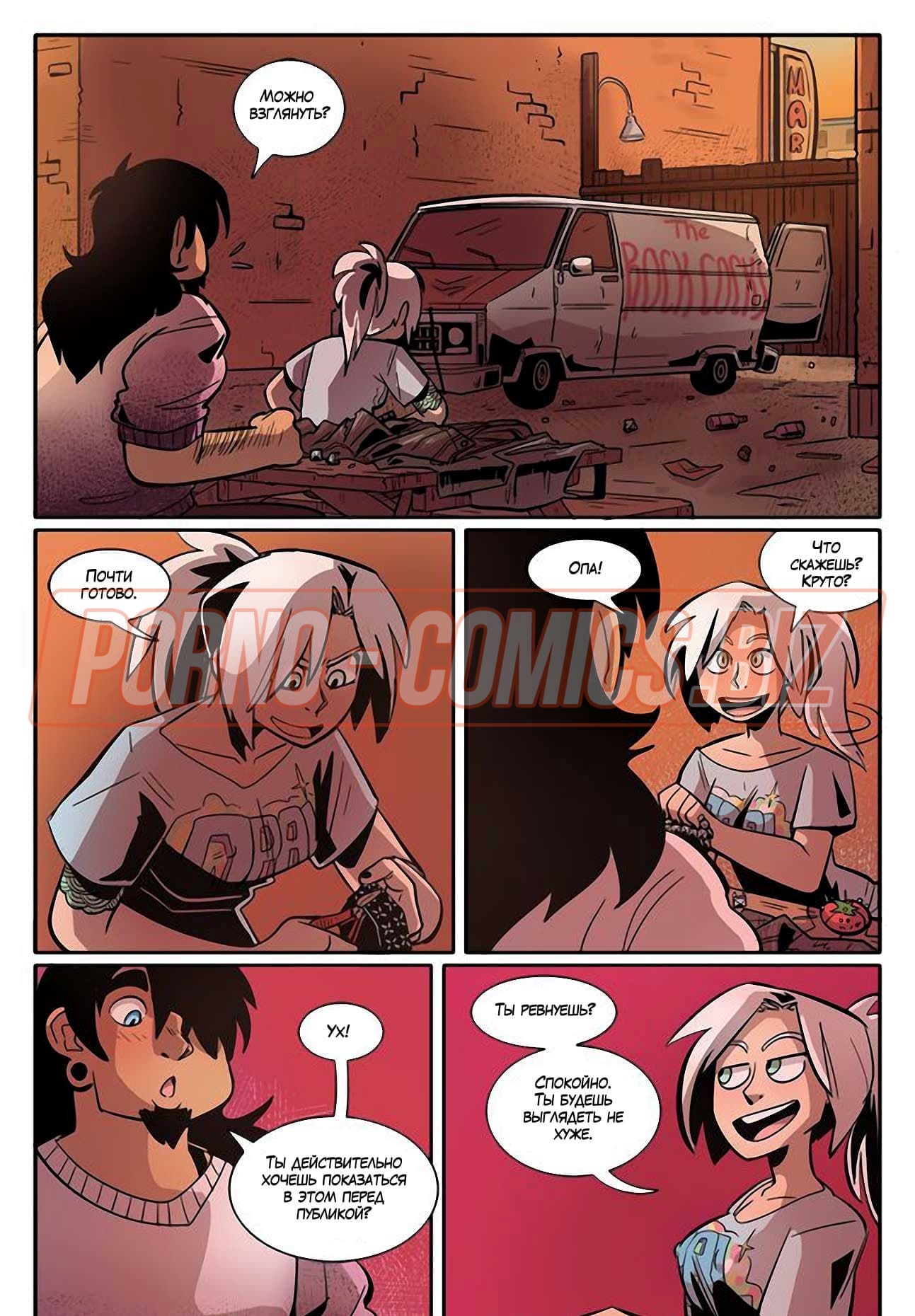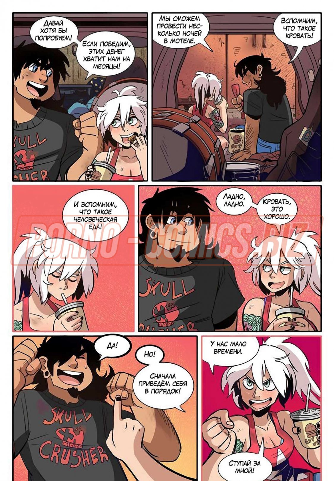 Уличные музыканты из секс комикса «Рок Перцы. Трек 2 Время показать тебя» живут прямо на улице и ведут довольно таки развратный образ жизни. У них очень мало денег, поэтому их одежда слишком проста и грязна. Телочки, чтобы заработать деньги на еду, показывают прохожим сиськи и даже делают им минеты. Когда группе музыкантов поступает деловое предложение, они сразу соглашаются.