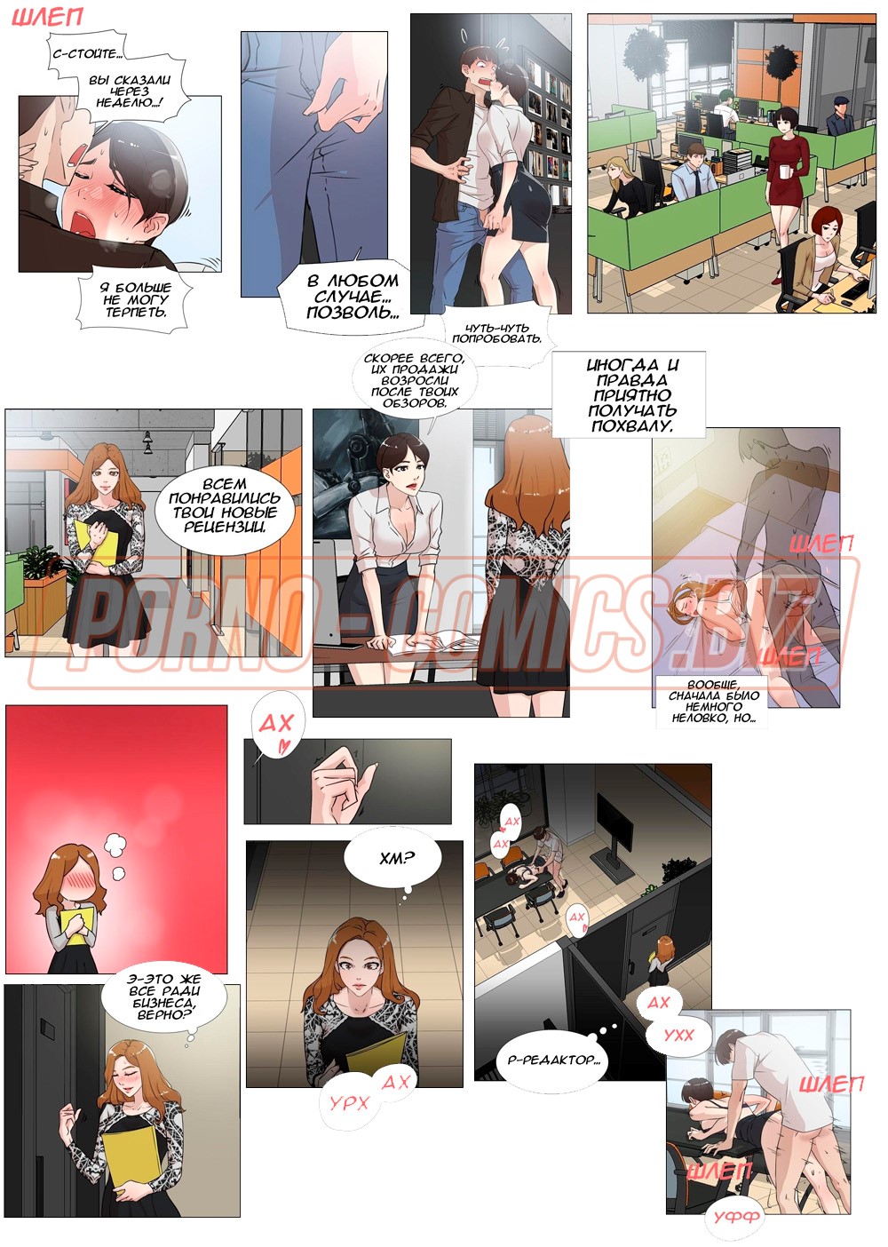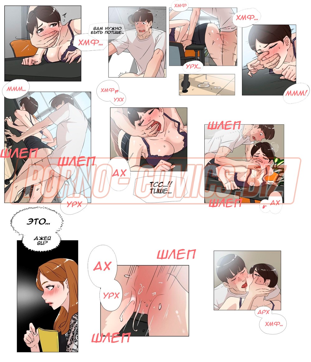 В 20 части возбуждающего порно комикса «Её 4 размер» страстный секс курьера и главного редактора. Начальница с большими буферами, разложившись на столе, страстно охает от того, что большой член курьера так глубоко проникает в ее киску. Пара наслаждается друг другом и даже не замечает, что за ними подсматривает сотрудница. Возбудившись, сучка отправляется в туалет, чтобы снять сексуальное напряжение.