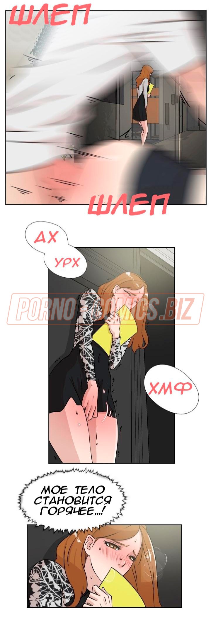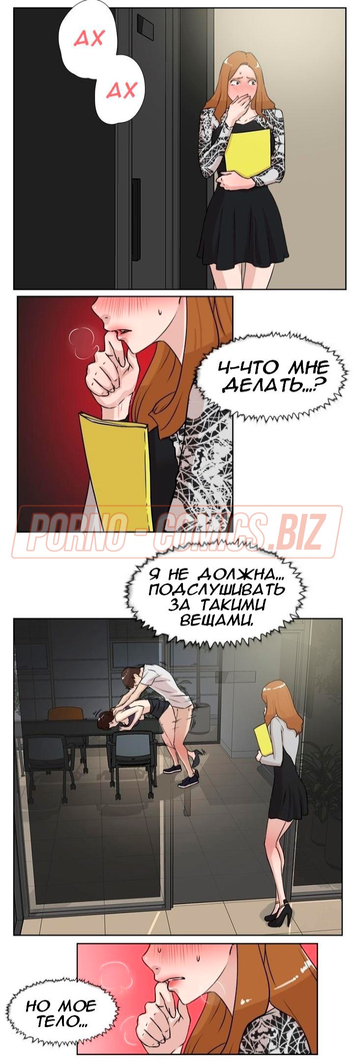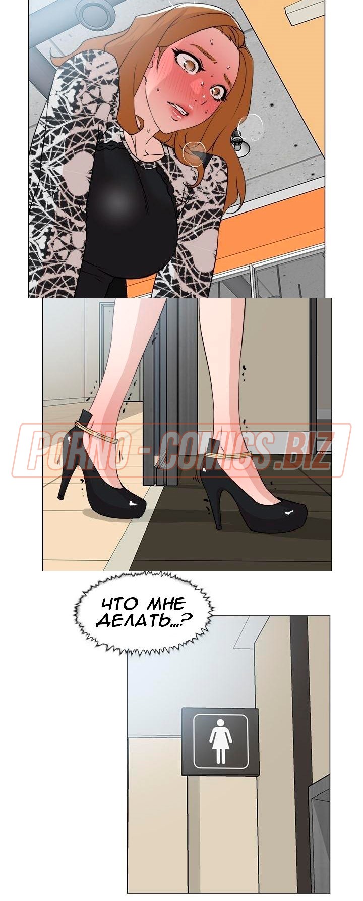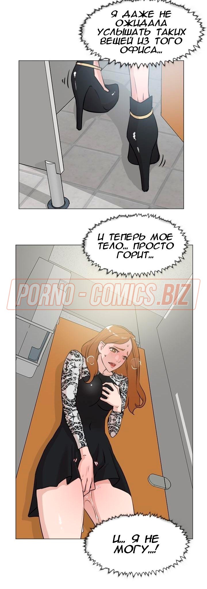 Сотрудница застукала курьера с главным редактором за сексом и мастурбирует в туалете - комикс «Её 4 размер. Часть 20»