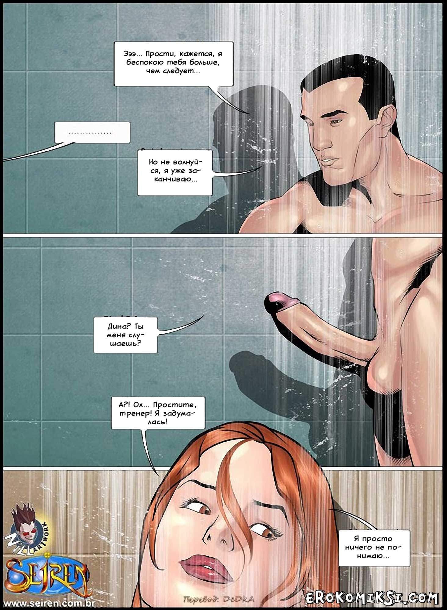 Пошлые seiren комиксы продолжаются! В очередном эпизоде порно комикса «Спортсменка» рассказывается о том, что тренер Дины, оказавшийся вместе с ней в душе, вовсе не гей, как все об этом говорили, что он и доказал Дине на деле