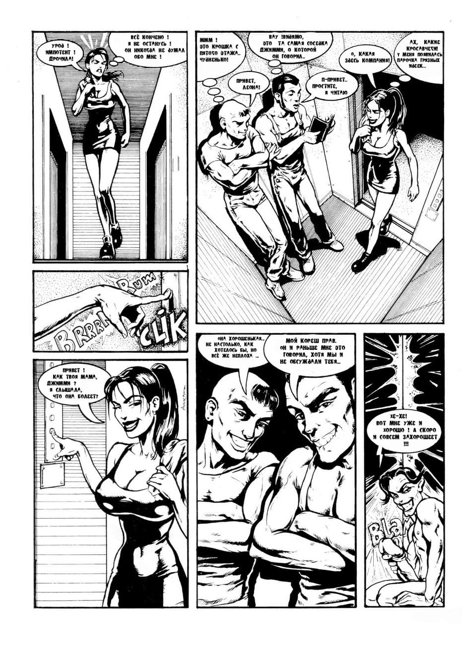 Порно история в комиксе об измене жены своему мужу, которая произошла в лифте с двумя молодыми парнями, которые долбили телку дуплетом.