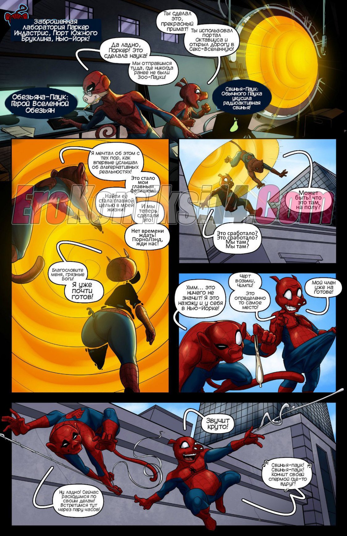 В этом комиксе нам рассказывают о двух версиях человека паука- Паук-обезьяна и Паук-свинья, который бродили по вселенным в поисках той самой секс-вселенной и