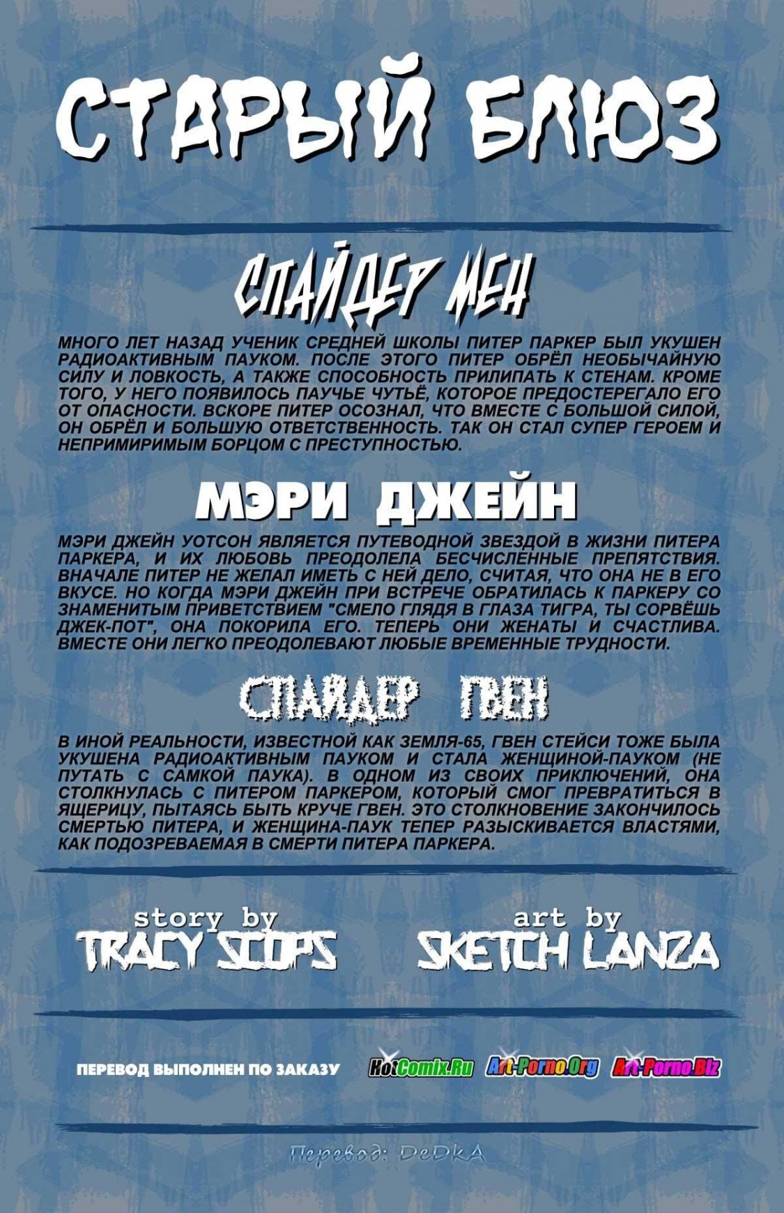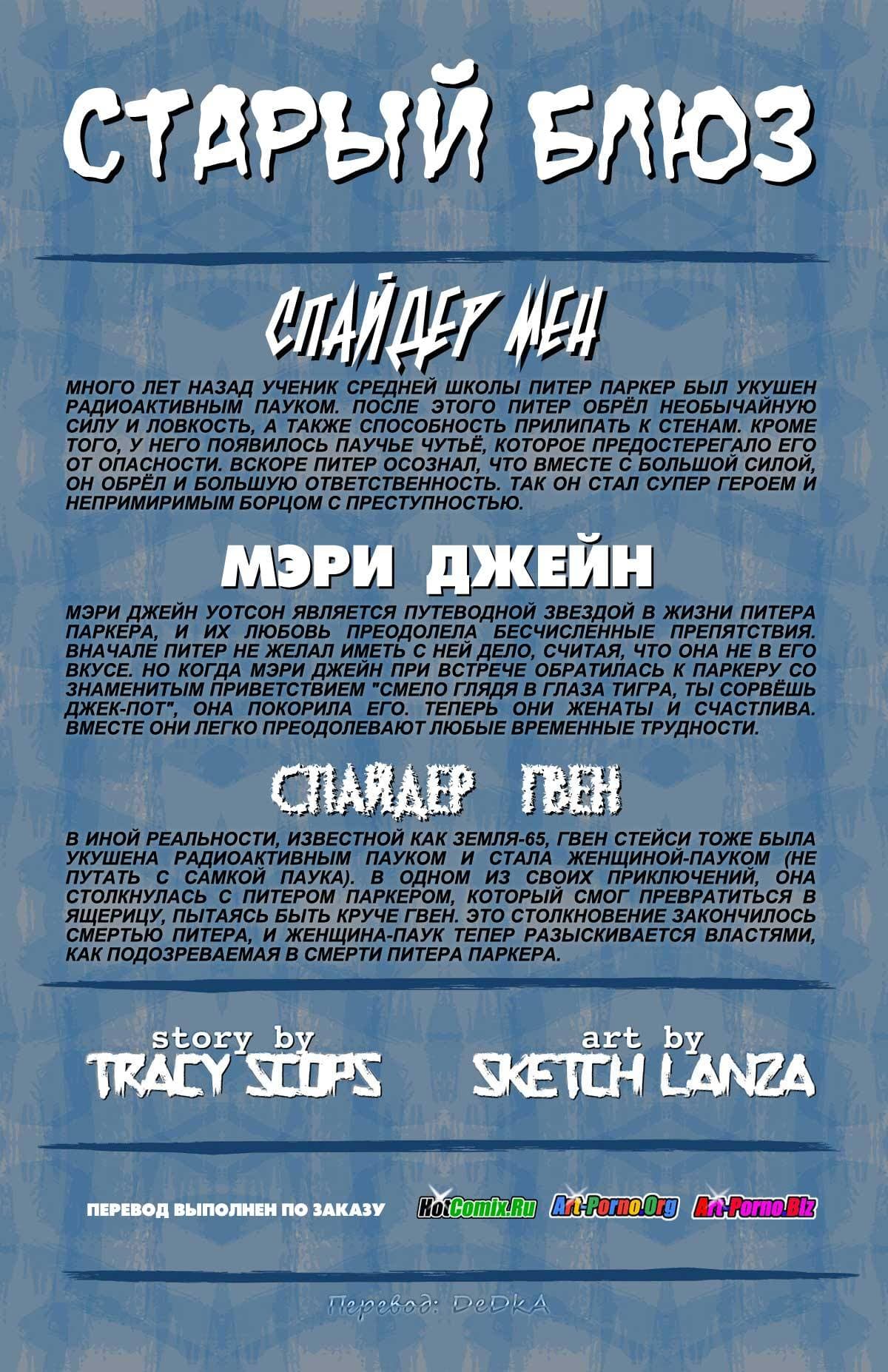 Порно комикс Старый блюз это пародия на «Человека-паука». Так с пределенных пор Мэри Джейн Уотсон и Питер Паркер живут счастливо в браке. Но все же прошлое