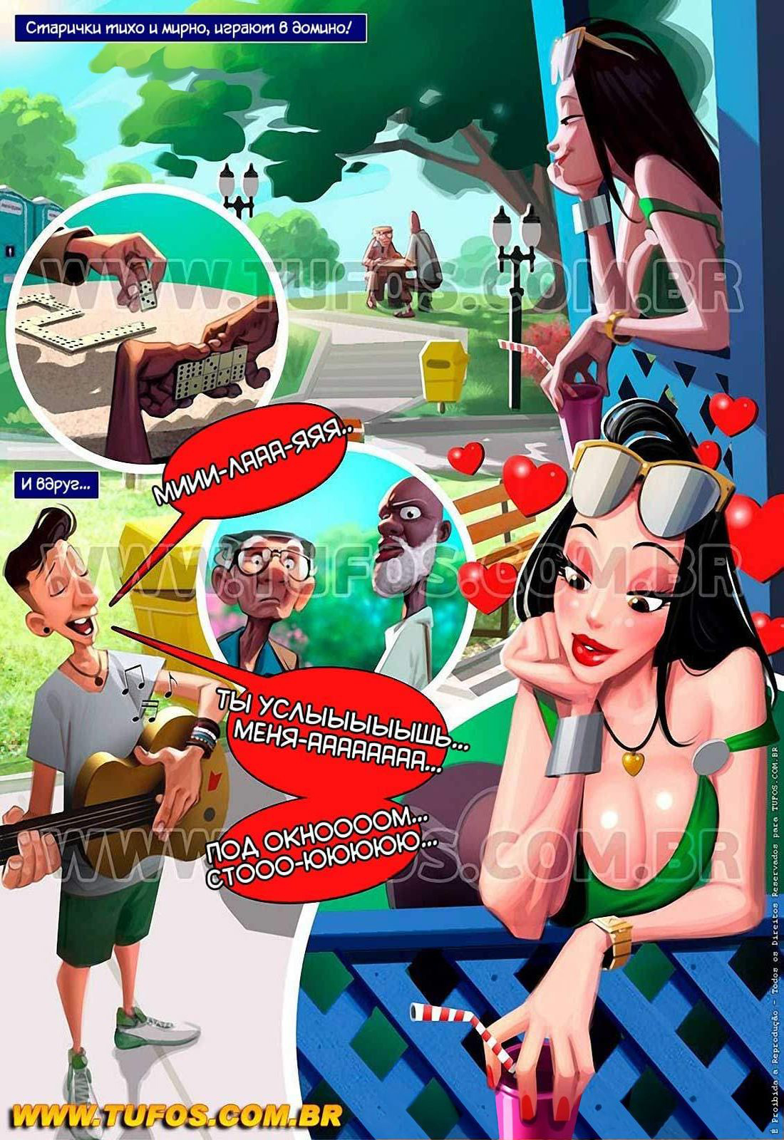 Поругавшись в парке с противным пареньком, старики решают ему отомстить. В этом секс комиксе «Удалые старички. Серия 4. Серенада любви» они разработали целый план мести. Дождавшись, когда спутница трахаря пойдет в туалет, старики сделали дырки в стене и просунули в них свои пенисы. Увидев такие огромные концы, сучка не удержалась и стала с ним резвиться. Она умело сосет пенис одного деда, а член второго смело принимает во влагалище.