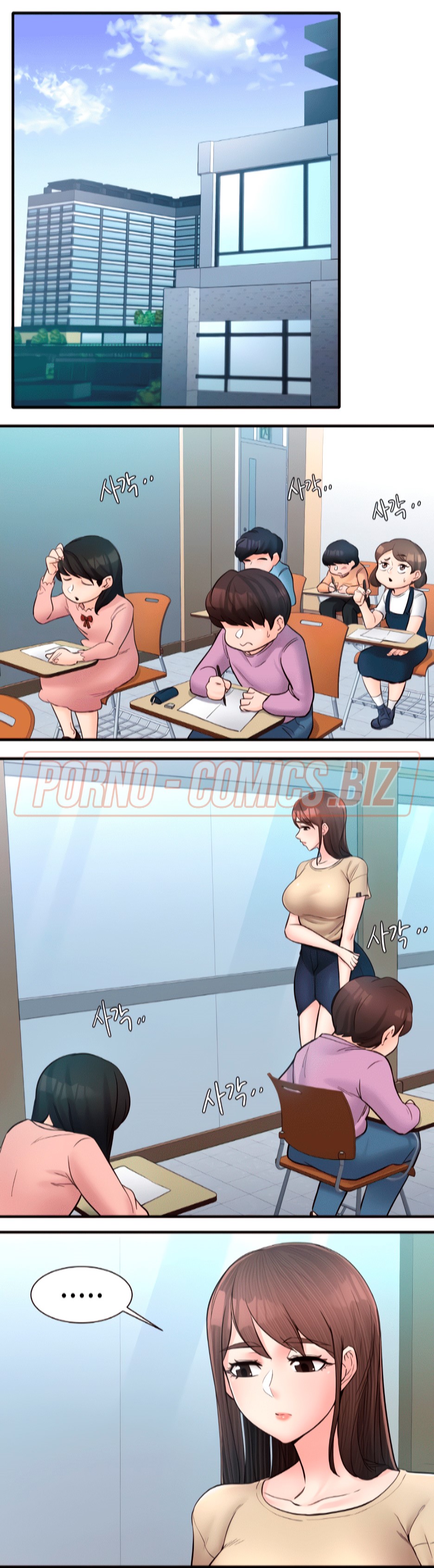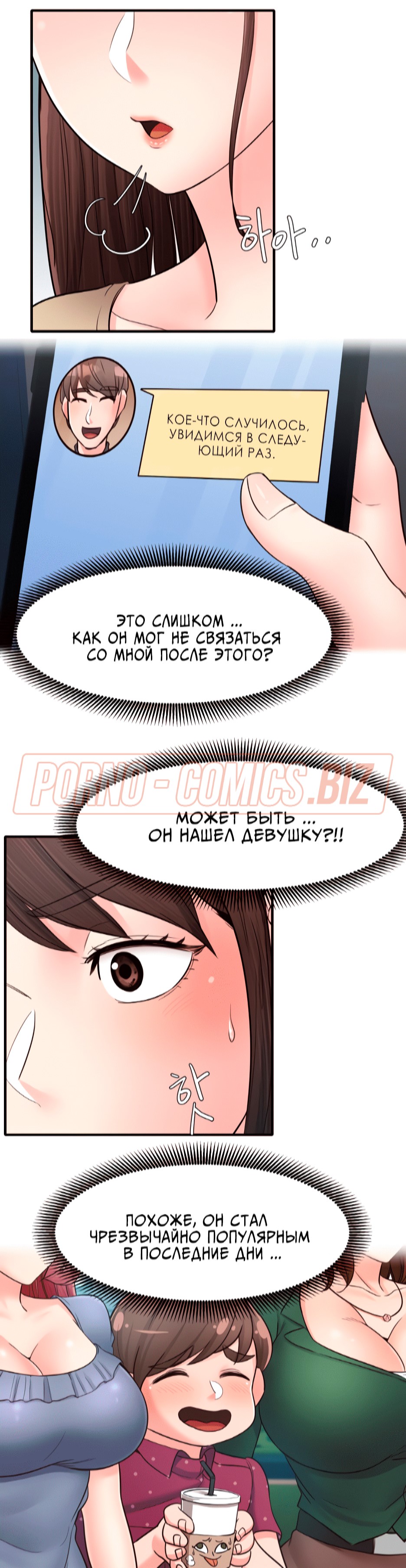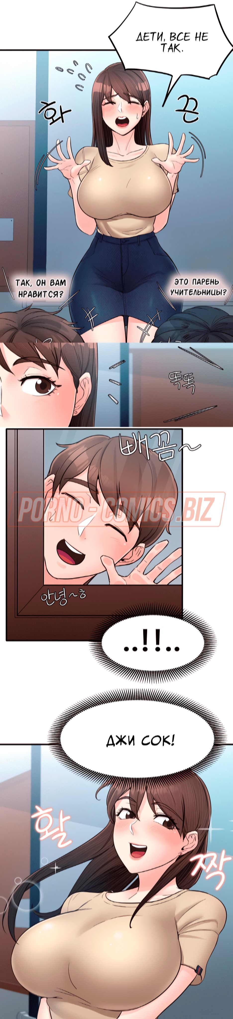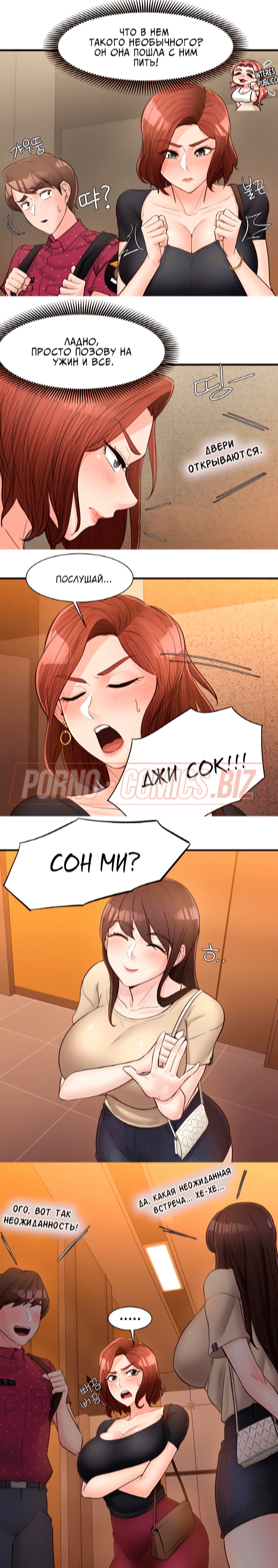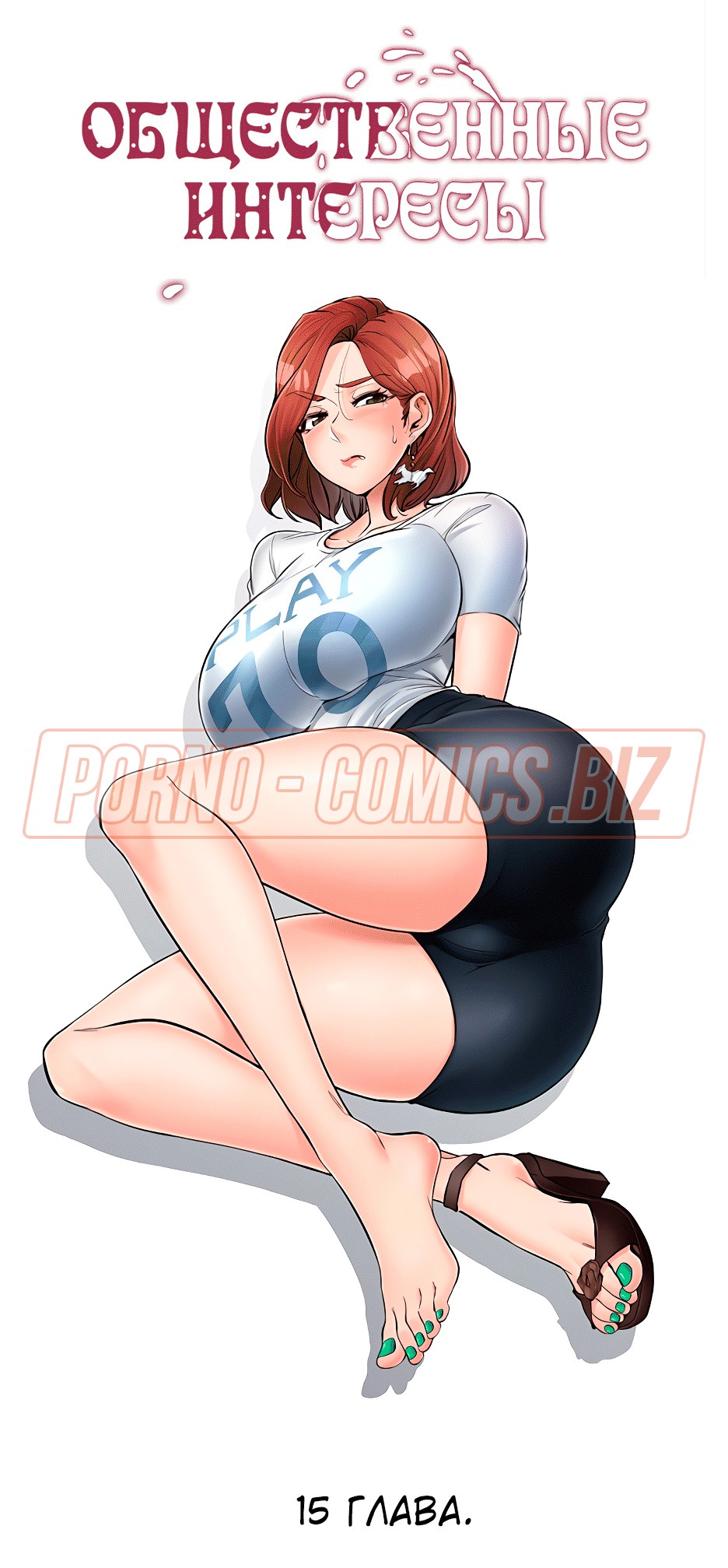 Пышногрудая и очень сексуальная училка из 15 главы комикса "Общественные интересы" так влюбилась в одного парня, что ни дня не может о нем не думать. Однако, сегодня развратник решил пропасть, из-за чего учительница чувствует себя одиноко. Оказавшись в лифте вместе с охранником, училка решает пригласить его к себе домой. Пока она решалась на такой смелый шаг, молодого охранника увела молоденькая телочка.