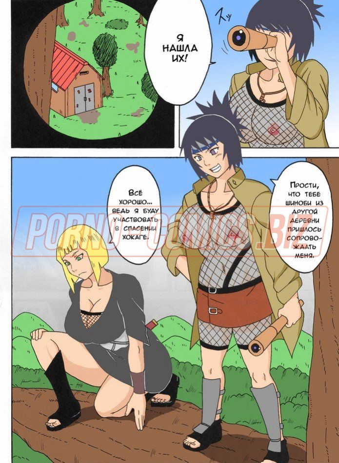 Попав в ловушку, Наруто и Хинате пришлось беспрекословно выполнять все указания злодеев. Герои комикса «Сексуальное заключение Тсунаде» посадили влюбленную парочку в клетке и заставили показывать публике, как именно человечество спаривается. Если они откажутся трахаться на глазах у толпы, они будут убиты. Деваться некуда, голая грудастая Хината отсасывает любимому и разводит ножки.