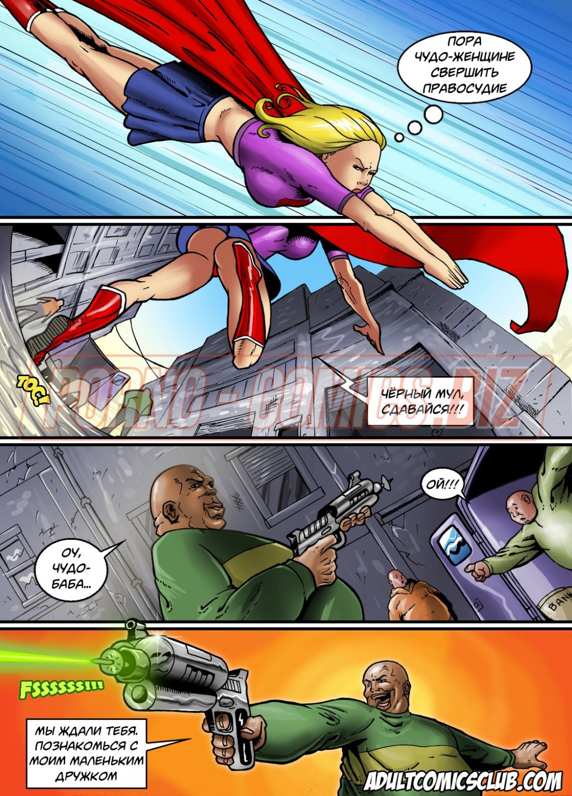 Смотрите секс комикс «Чудо женщина и Черный мул», где развратная супер-героиня, увидев как зловещая банда грабит очередной банк, решает им помешать. Красотка с пышным бюстом приказывает мужикам остановится, не зная того, что у них есть против нее оружие. Взяв под свой контроль разум Чудо женщины, Черный мул хочет, чтобы она разделась и, отсосав каждому член, дала ебать себя в киску.