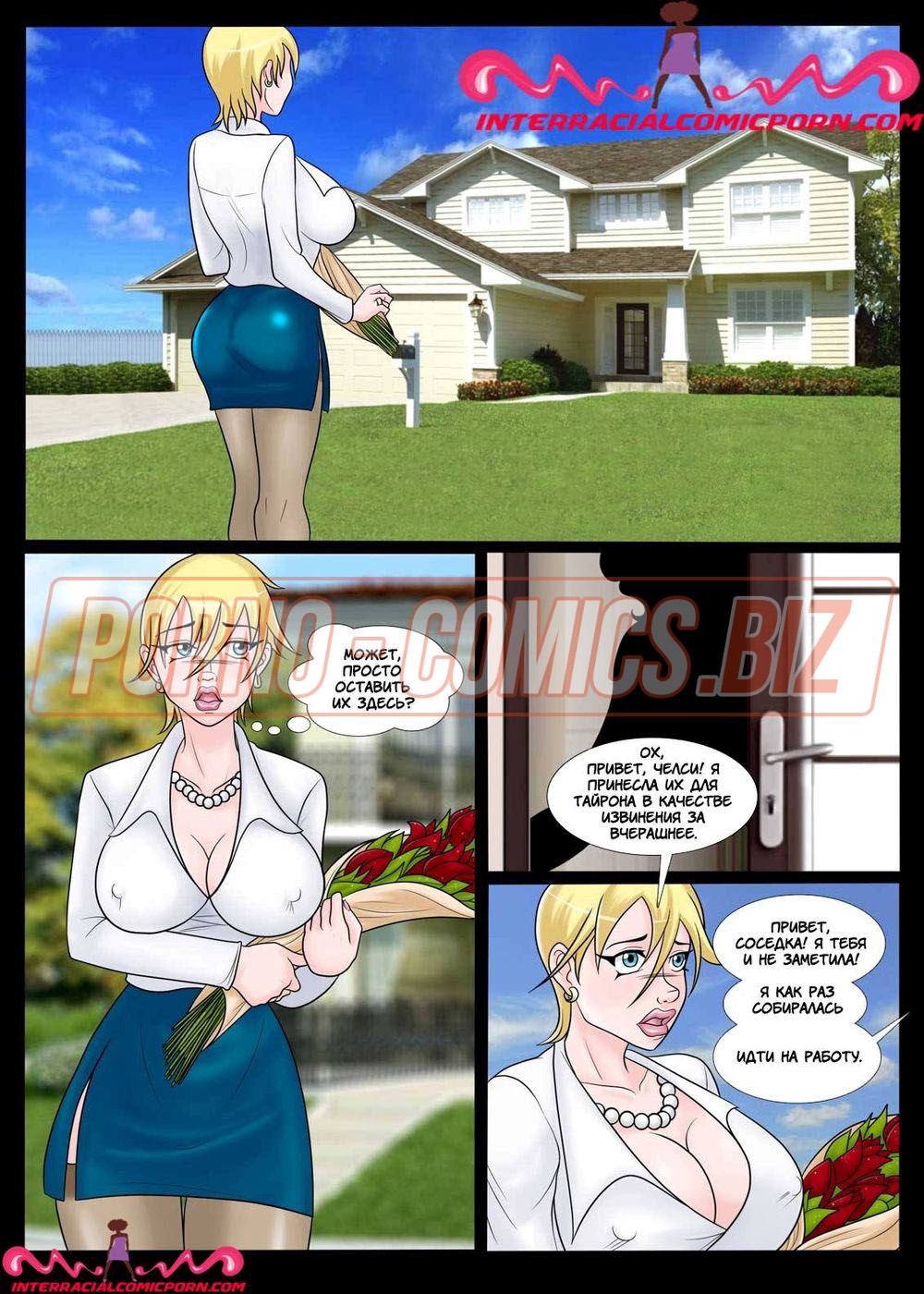 Во второй части комикса «Новый сосед" вы увидите продолжение возбуждающей картины. Соседка не успокаивается и, чтобы извиниться перед чернокожим парнем за то, что случайно ударила его по голове, покупает цветы и идет к нему домой. Женушка соседа как раз уехала на работу, значит дома, кроме трахаря никого нет. Увидев соседку, он был счастлив, ведь понимал, что та пришла не извиняться, а за хорошим качественным трахом.